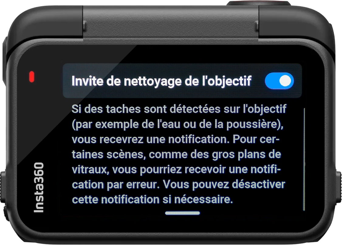 On – So, just a quick note, as I write these lines you will be notified that there is a stain like a fly squashed on the lens only before to start recording. So it's a more to warn you between 2 plans If you don't check it yourself, but I hope that eventually an update will be provided to us. during the recording with vibrations in order to stop and give the lens a clean!