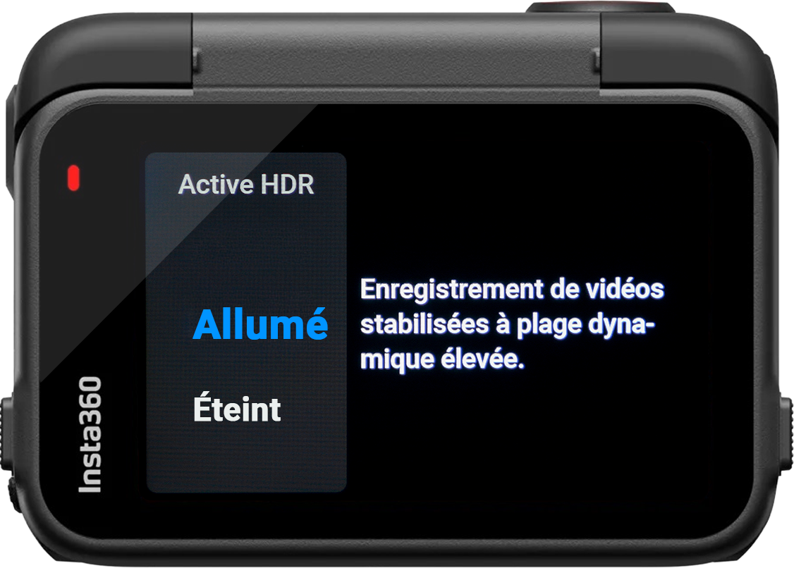 Allumé Le HDR (High Dynamic Range) permet de préserver plus de détails dans les zones très claires et très sombres de ton image. Le résultat : une vidéo plus équilibrée, avec des couleurs plus riches et naturelles, surtout quand tu filmes dans des conditions de fort contraste (ciel lumineux, ombres marquées, contre-jour)..