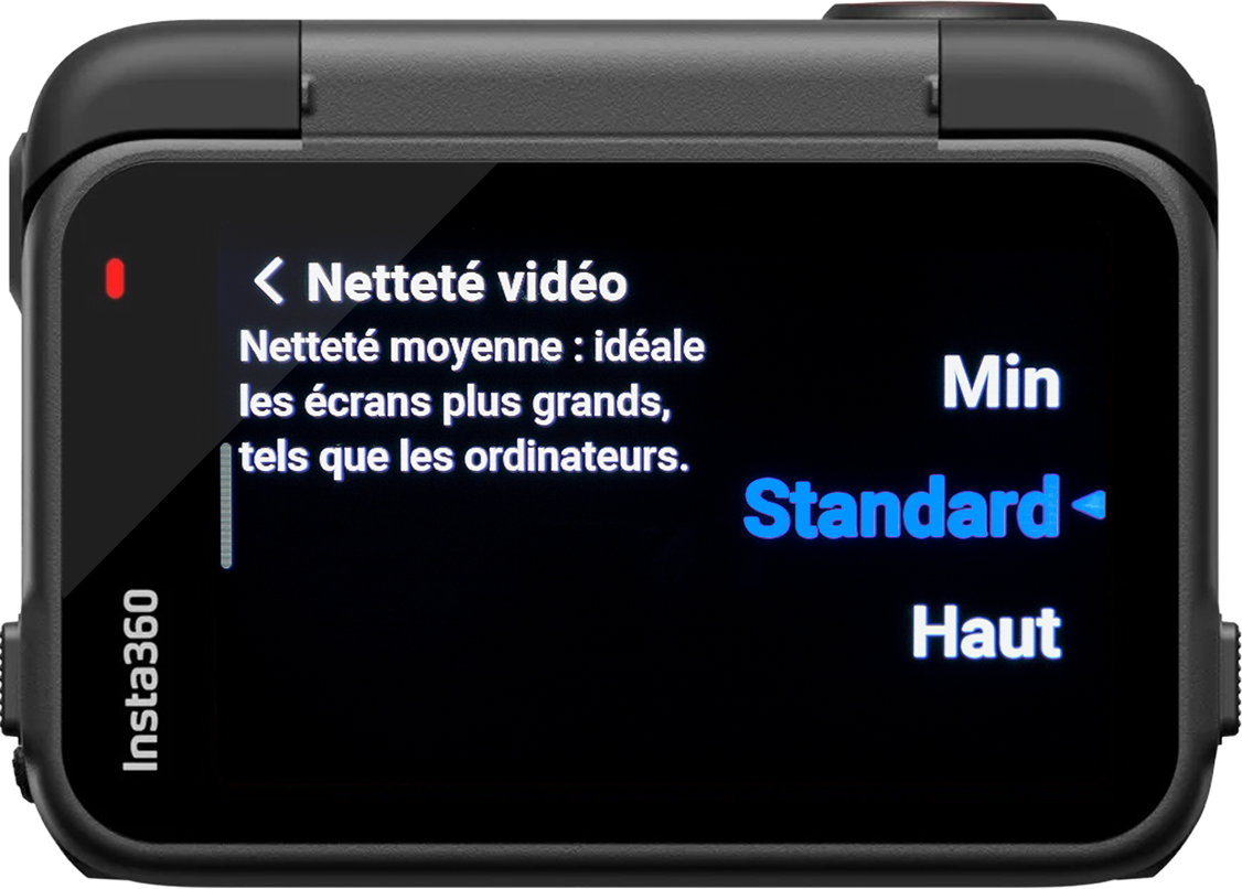 Standard – Sur le paramètre « Min » vos vidéos seront floues, comme si la mise au point ne s’était pas faite donc ce n’est pas agréable à regarder. Sur le paramètre « Haut » il y a trop de netteté et la vidéo rend comme si elle avait été filmée avec un téléphone, ce n’est pas naturel et trop prononcé. Notez que si ça vous chante, vous pourrez au montage jouer sur la netteté en l’augmentant ou la diminuant.