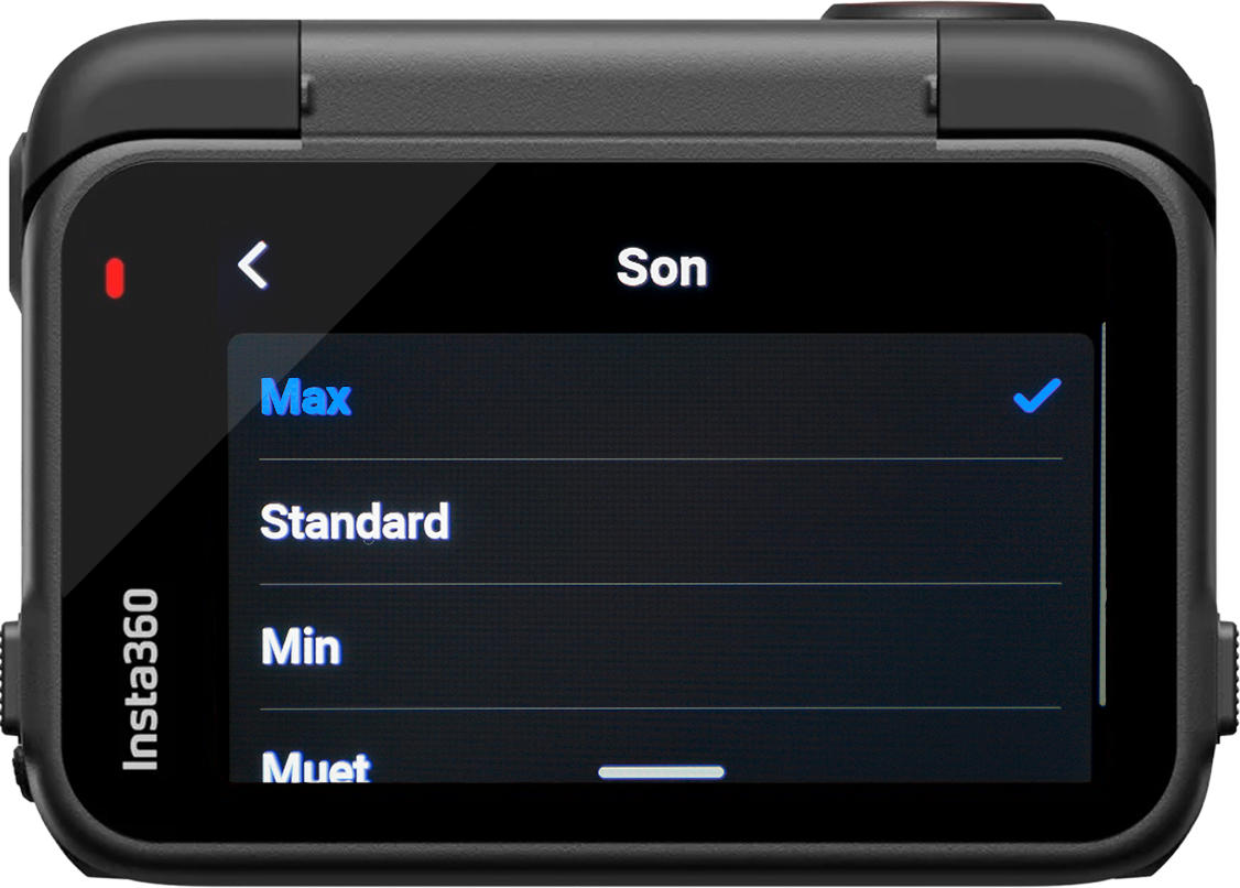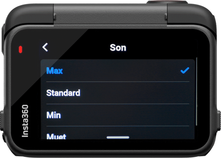 Max – Le bruit du vent ou de la moto peuvent vous empêcher d’entendre les signaux sonores d’allumage, de début ou de fin d’enregistrement et d’extinction de la Ace Pro 2. En les mettant sur le réglage max vous devriez être en mesure d’entendre en roulant si vous avez bien allumé votre Ace Pro 2 et démarré un enregistrement.